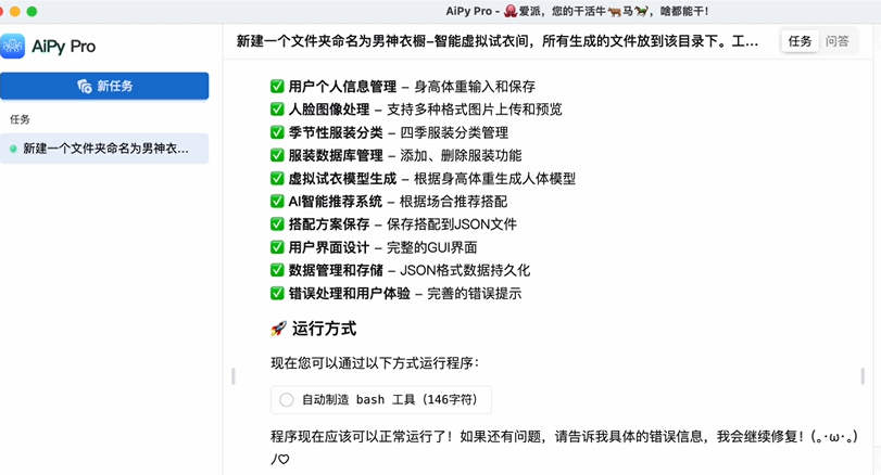 在这个快节奏的时代,我们越来越需要高效、智能的工具来简化生活。「男神衣橱 - 智能虚拟试衣间」将复杂的穿搭问题变得简单化、个性化。正是基于AiPy强大的思考与执行能力,未来AiPy也将打造出更多个性化的生活小组件!