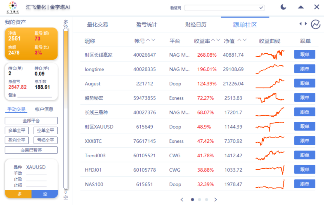 汇飞量化以趋势交易为核心,推出【时区】系统和【金字塔Ai】工具,通过极简择时理念和智能风控技术,帮助用户捕捉全球市场机会。系统永久免费开放,提供半自动和全自动交易模式,支持黄金等高波动品种的日内交易。配套的【时区跟单社区】严格筛选趋势策略,打造稀缺的优质信号平台,让交易者共享趋势红利。汇飞量化致力于成为全球量化交易的标杆品牌。