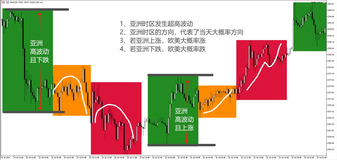 一天清晰划分为三个关键时段:亚盘(绿色)、欧盘(橙色)、美盘(红色)。