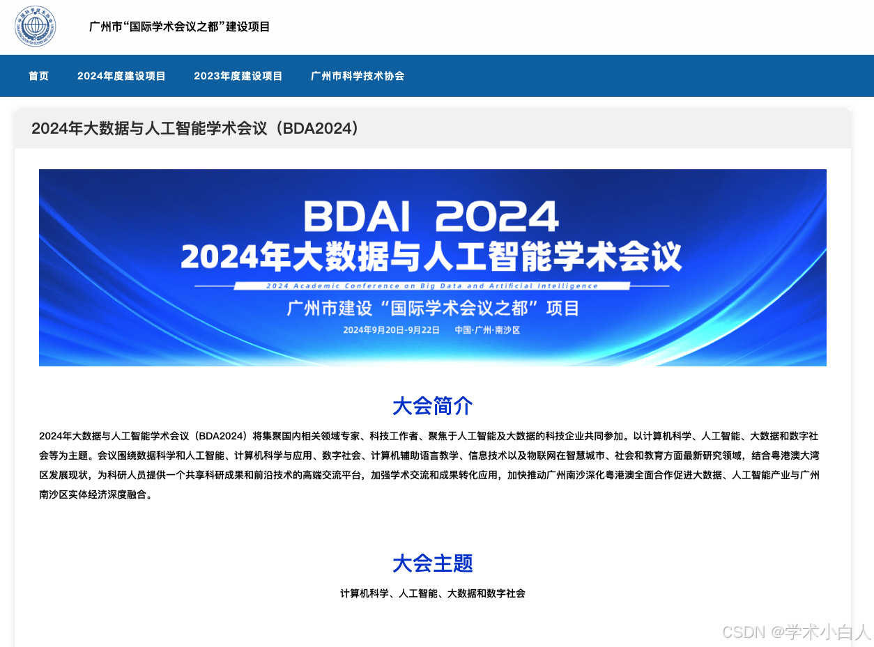 2024年大数据与人工智能学术会议(BDA2024)将于2024年9月20日至9月22日于广州市南沙区举行。会议由中国计算机学会(CCF)主办、中国计算机学会广州分部、广东省计算机学会承办、香港科技大学(广州)协办。本次大会同时是广州市“国际学术会议之都”建设项目。