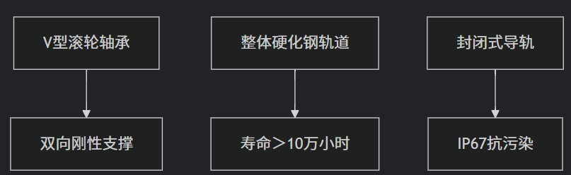 精密传动机制:70° V型滚轮与轨道线接触设计,实现零间隙啮合,重复定位精度±0.05mm