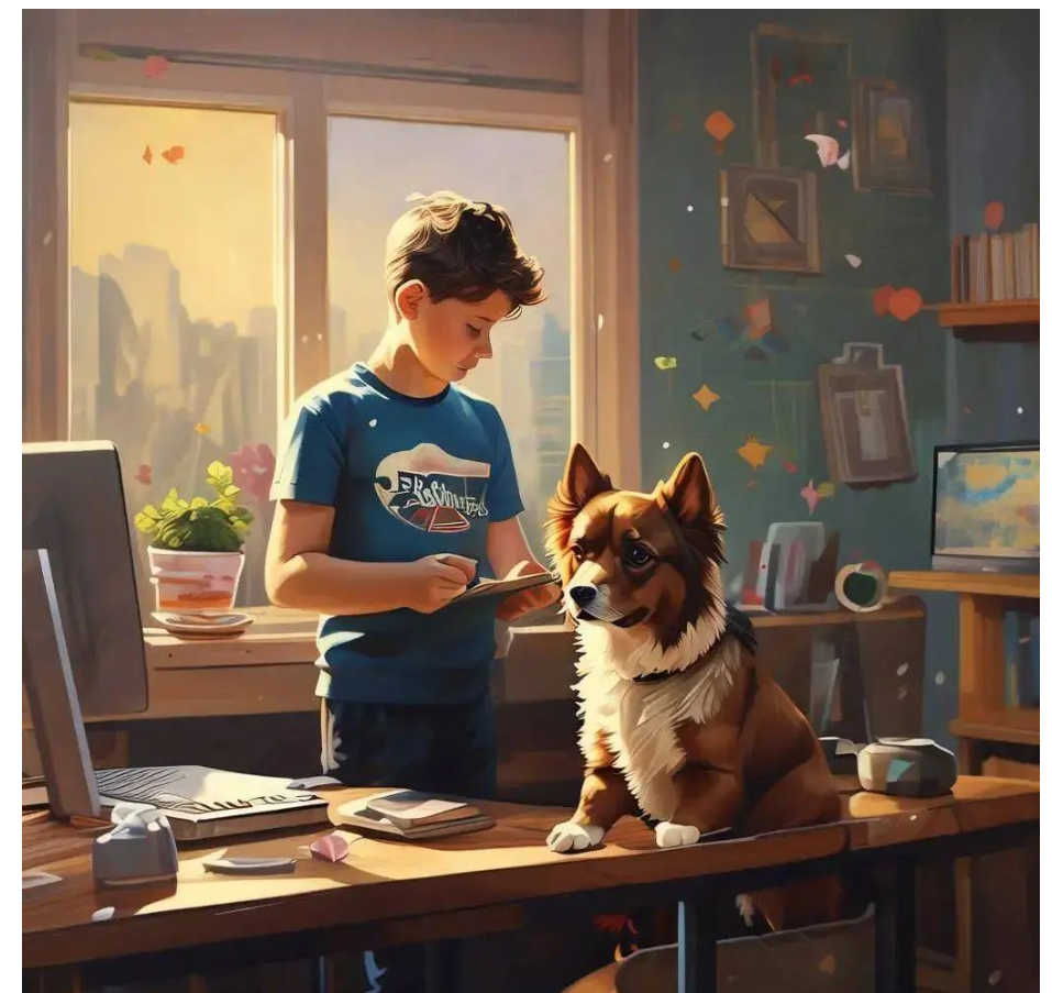 测试的prompt是:Painting a boy coding in front of the desk, with his dog.,测试结果如下,效果还是很不错的: