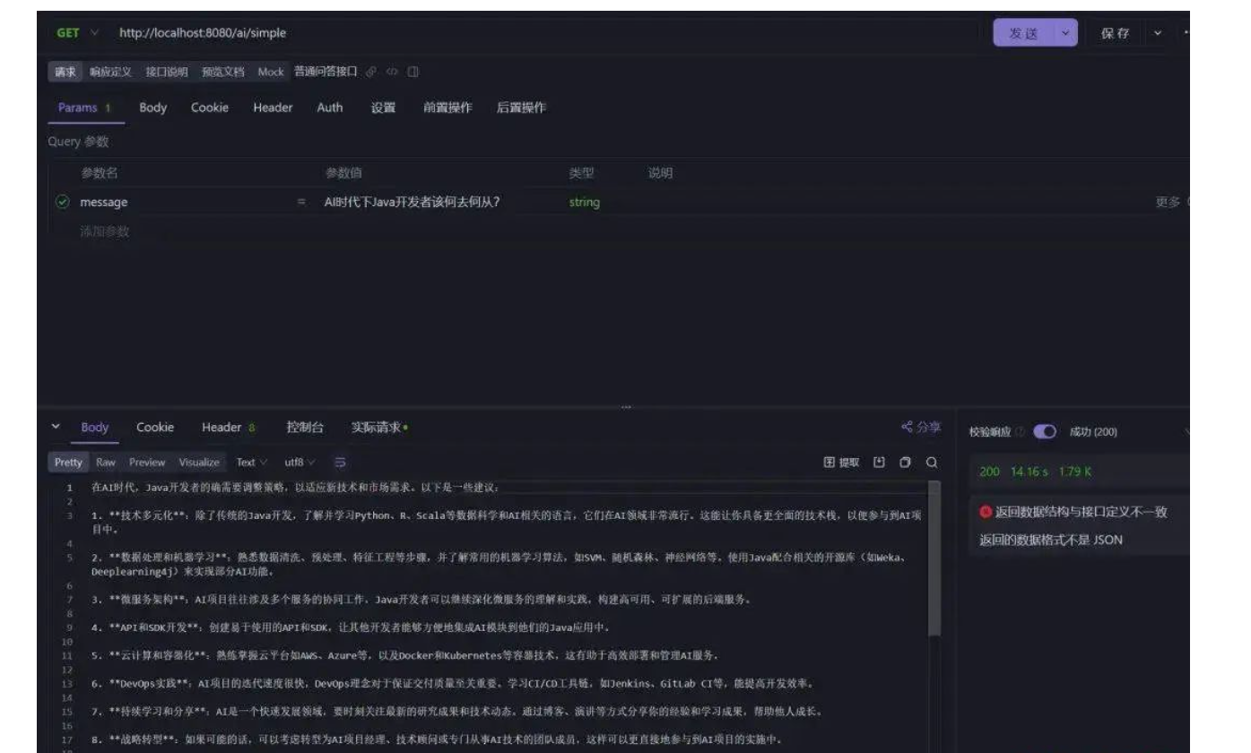 我们发送一个请求,prompt是AI时代下Java开发者该何去何从?测试结果如下: