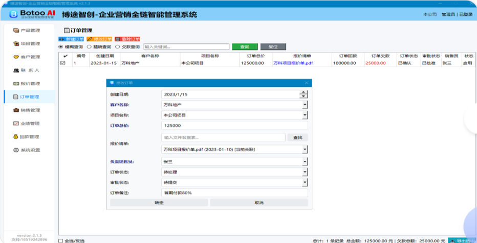 1.智能业务联动:独创"报价单→订单→业绩"一键转化机制,支持历史版本追溯,消除重复录入。订单状态与回款实时联动,欠款金额自动计算精度达99.9%