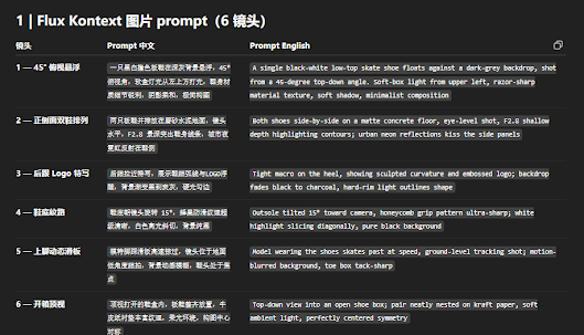 1. 给出6个镜头图片的prompt,支持Flux Kontext生成,Prompt需包含中文版和英文版,支持不同角度展示这双鞋