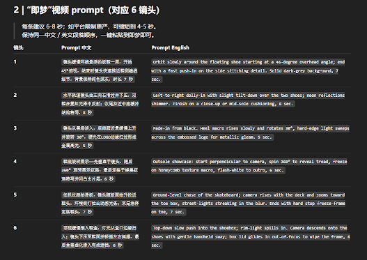 2. 给出这对应6个镜头的视频生成prompt,支持用即梦来进行生成,prompt需要包含中文版和英文版,需要结合特写镜头一起