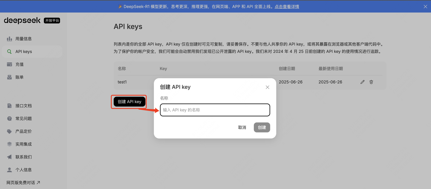 DEEPSEEK_API_KEY 是DeepSeek的API key 可以到DeepSeek官网去创建: