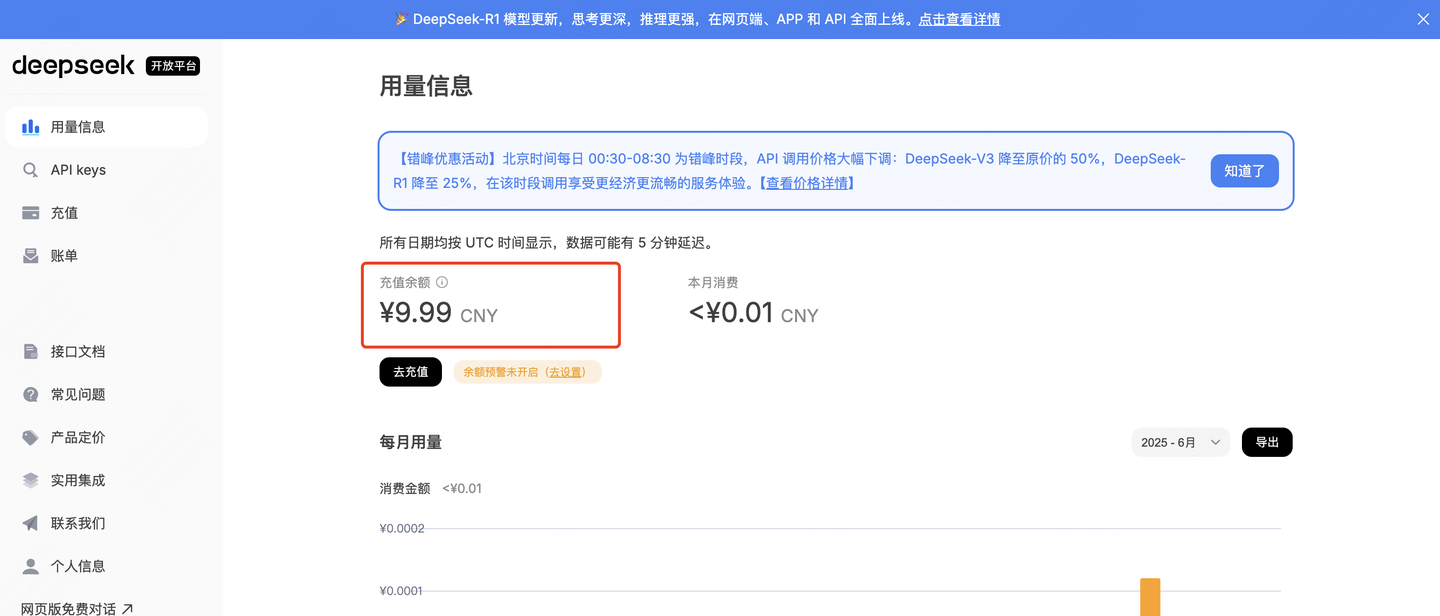 第四步,需要查看自己的deepseek账户是有有余额,没有是会报错的