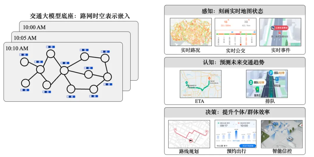 基于预训练的交通图嵌入,通过Zero-Shot或者Fine-tune应用于通行时间预估、交通流量预估、路线排序、智能信控等场景。