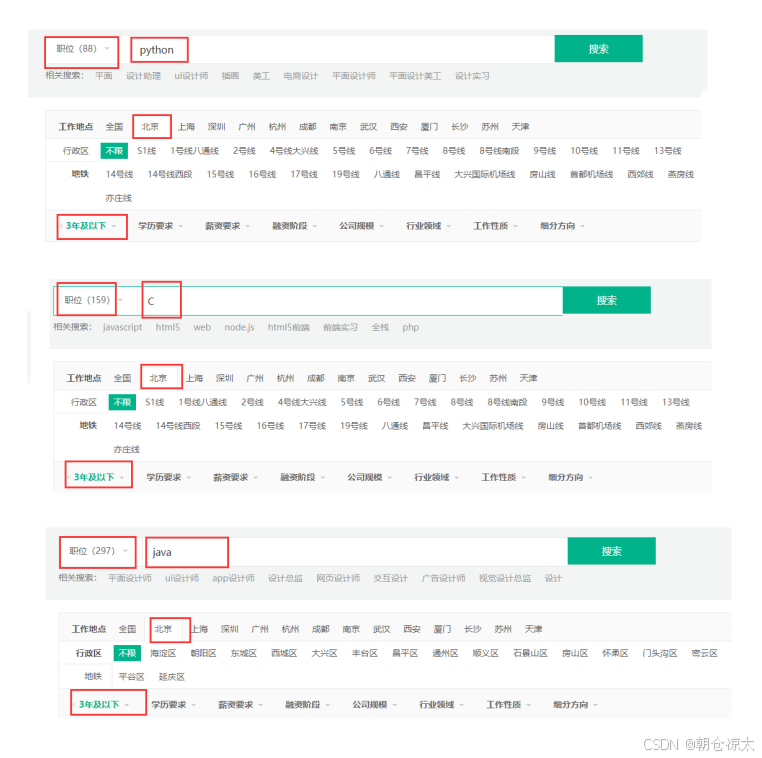 以知名互联网招聘网站-拉钩网为例,设置工作地点为北京,工作年限为3年以下: