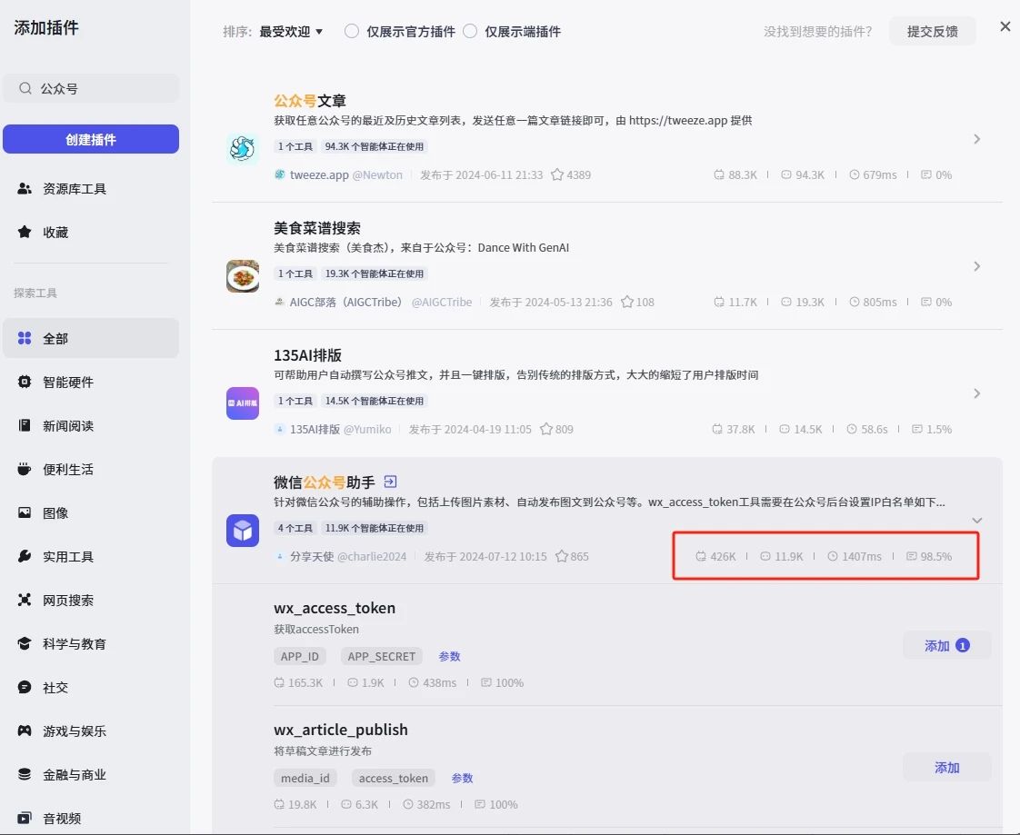我们在插件市场输入“公众号”关键字,然后根据插件的使用量、响应时间、成功率,选择一个合适的插件即可。