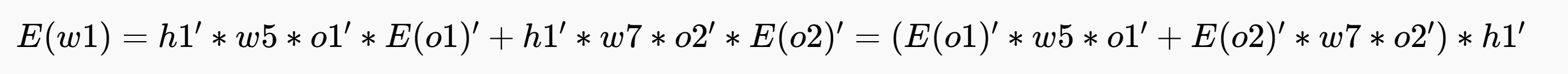 隐藏层h1有 两条线路:h1->o1->E和h1->o2->E,对w1在两线上分别求导然后相加