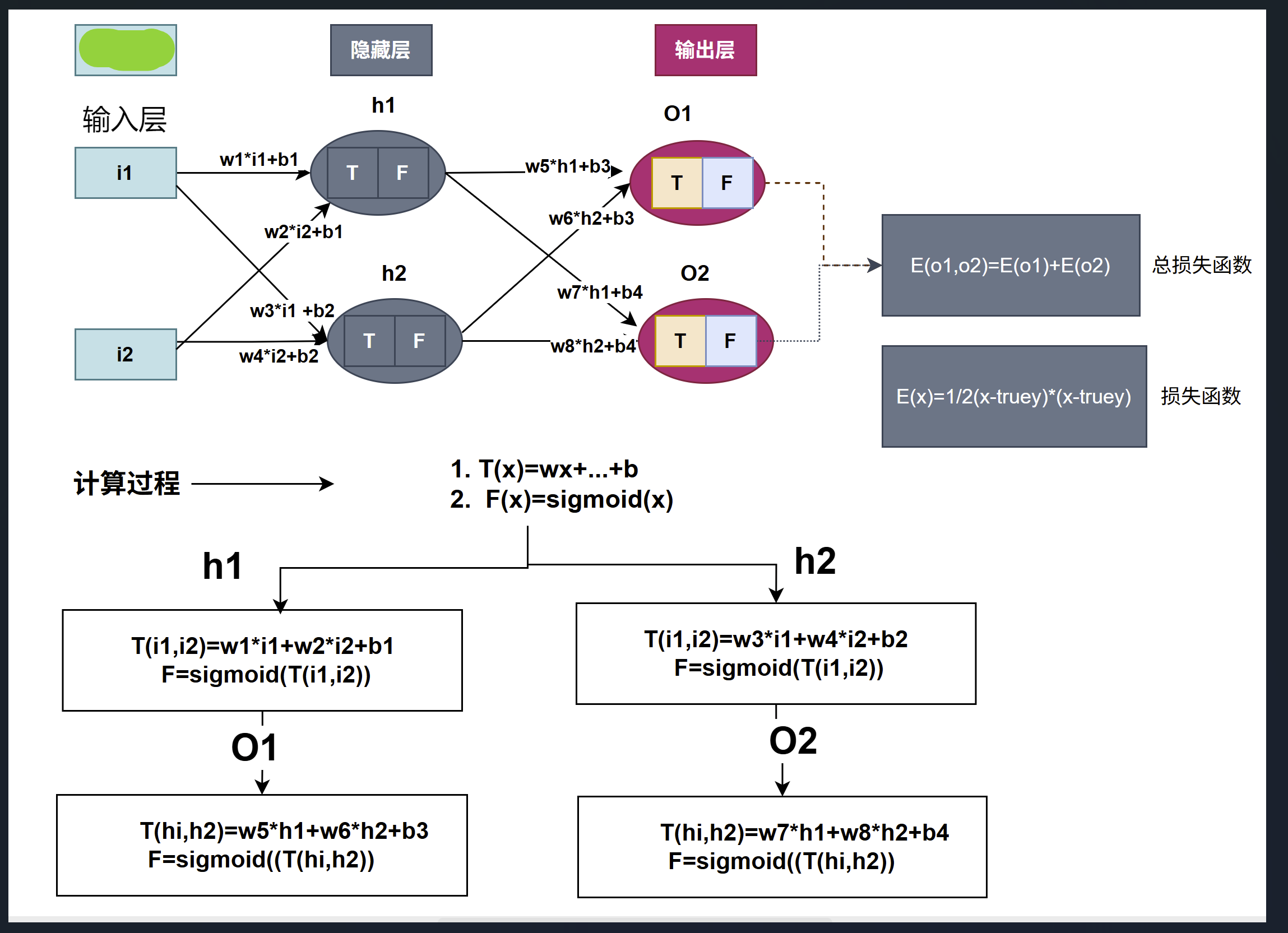 输出层:O1, O2,真实值(期望值)O1 = 0.01, O2 = 0.99