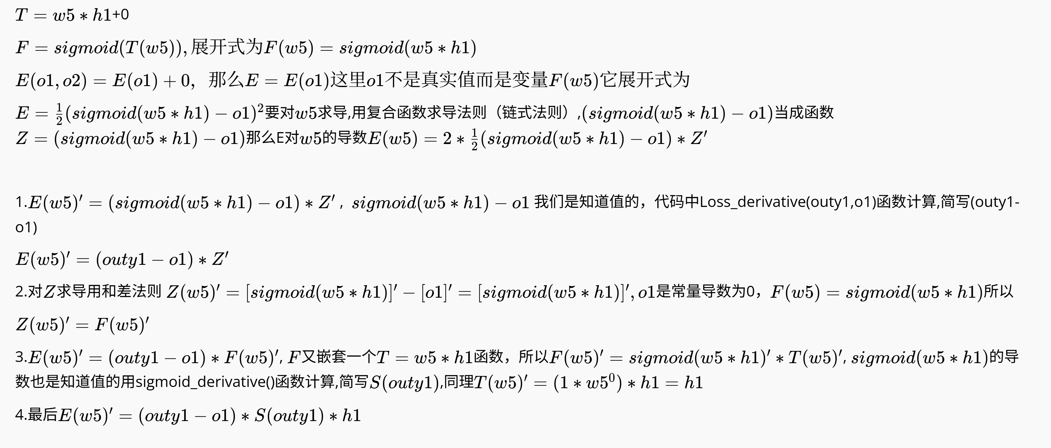 从流向上看 w5 经过加权求和函数T,然后经过激活函数F,最后是损失函数E,是层层嵌套进去的,利用复合函数求导法则分别对函数T、函数F、函数E求导相乘