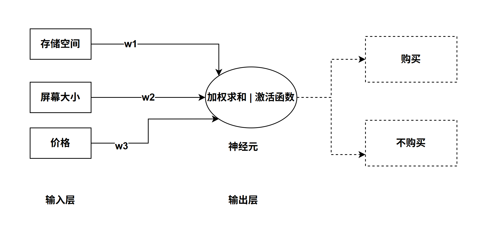 还是举买手机的例子,假如只考虑 参数:存储空间、屏幕大小、价格。如果存储空间、屏幕大小都一样,价格分别为(1200,1500),从中选择购买一部手机,用数学公式Y(价格) = 存储空间 *w1+屏幕大小*w2 +价格*w3 ;