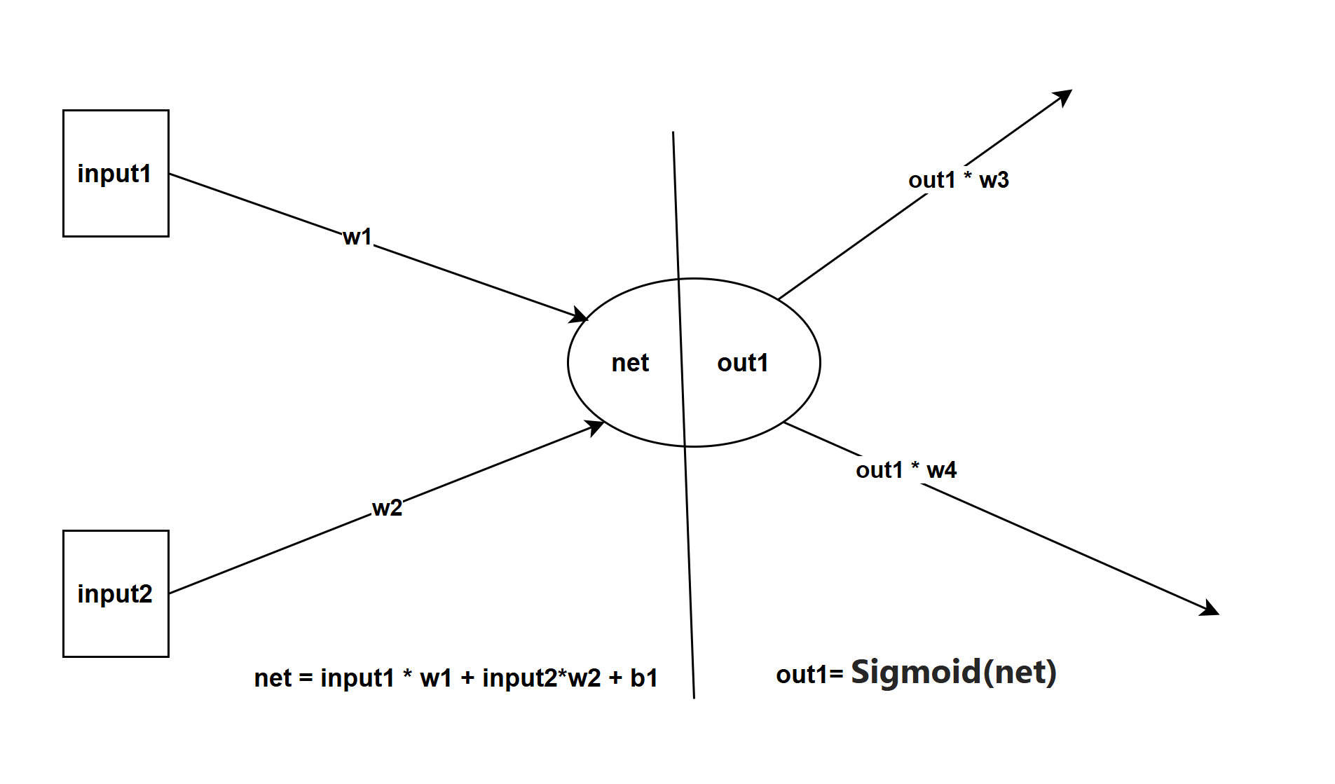 如上图 加权求和公式 net = input1* w1+input2*w2+b1;其中input1、input2是变量,w1(权重)、w2(权重)、b1(偏置量)是已知值随机值或任意值都可以,用数学公式表示为: