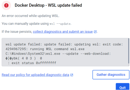 也就是在安装或更新 Docker Desktop 时,可能会遇到 WSL(Windows Subsystem for Linux)更新失败的问题。WSL 是 Docker Desktop 在 Windows 上运行所需的一个重要组件。如果出现这种情况,可以尝试在命令提示符或 PowerShell 中手动运行以下wsl --update命令来更新 WSL: