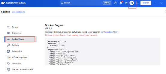 点击docker设置的docker engine 把上面的代码放进去。然后重启docker服务。