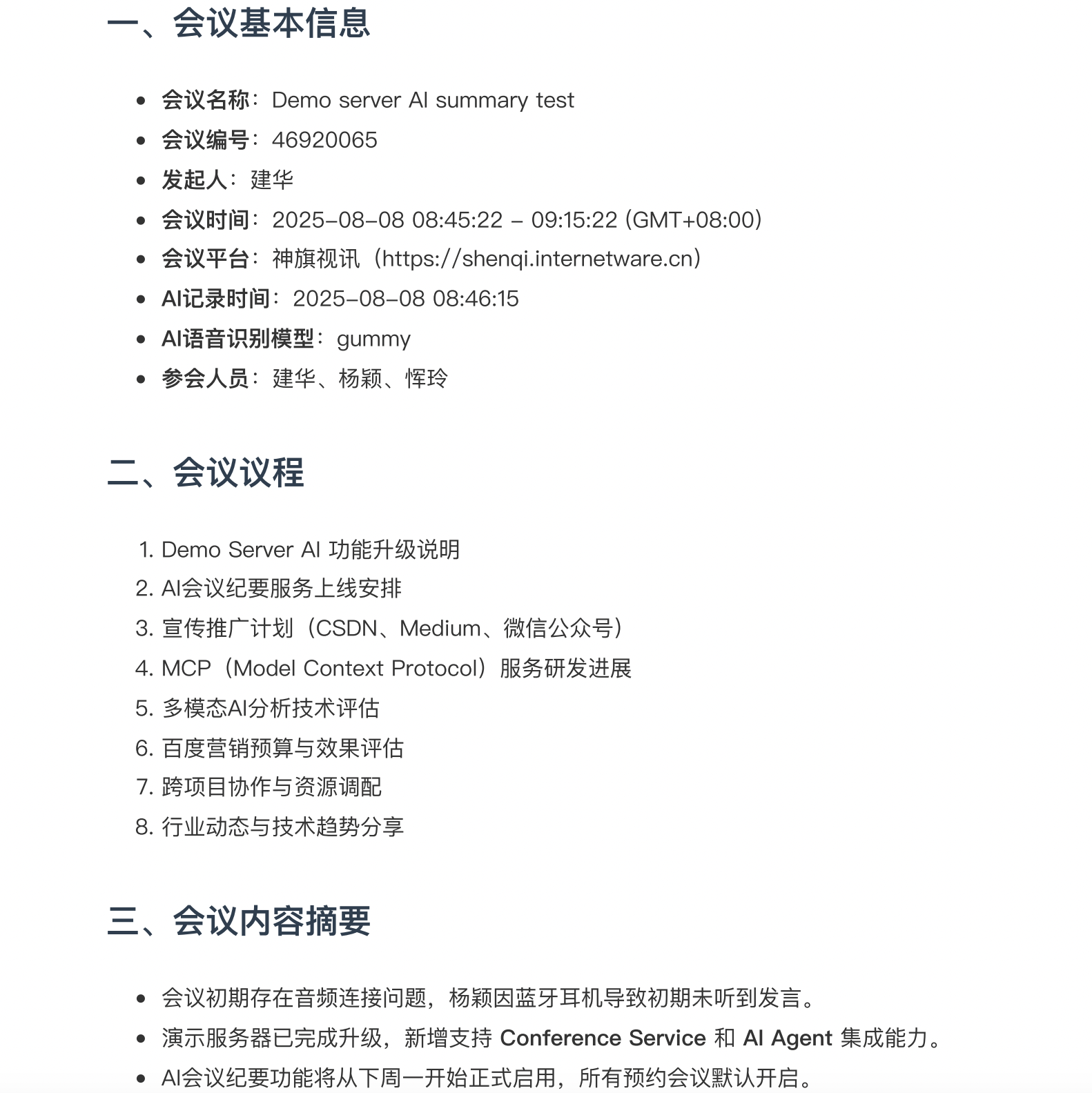 通过与主流企业邮箱平台(如Microsoft Outlook、Exchange、Notes等)的深度对接,系统可在会议结束后自动将AI生成的关键内容——包括智能纪要、任务清单、决策要点及参会人摘要——精准推送至相关人员的邮件收件箱。为此,神旗视讯推出全新“AI Server”解决方案,深度融合先进AI技术,提供AI实时转写、AI智能会议纪要生成、以及企业级邮件协作功能,旨在打造一个集沟通、记录、总