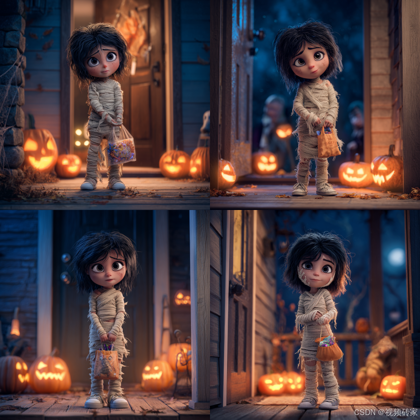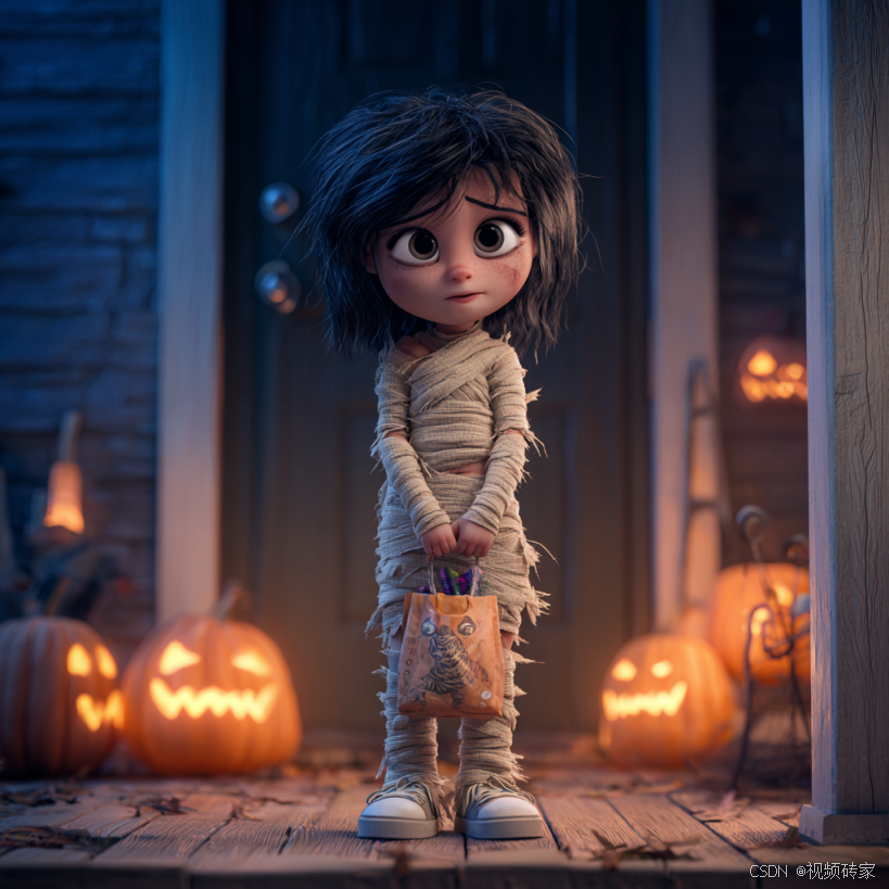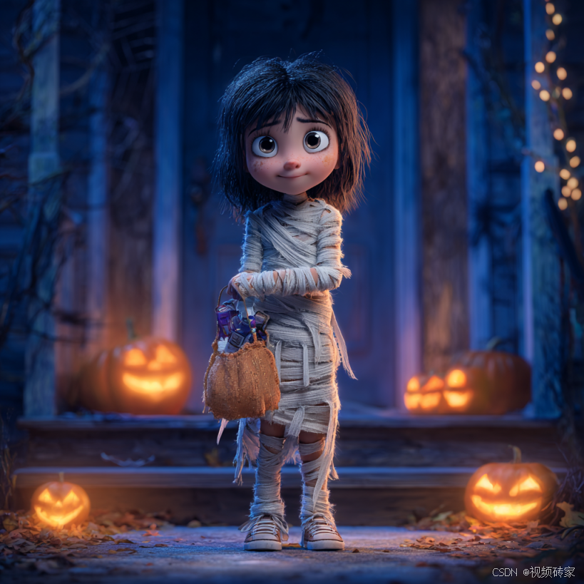 Prompt提示词:Soft-focus, cinematic portrait of a young girl, dark hair, standing on a warmly lit porch on Halloween night, modern suburban house, dressed as a mummy in carefully wrapped gauze with frayed fabric edges, clutching a small candy bag, subtle smile of pride and shyness, sad but hopeful, skin has irritation on it, gentle autumn breeze ruffling the wraps, glowing jack-o’-lanterns at her feet, deep blue night in the background with faint blurred trick-or-treaters, her friends in other costumes behind her, stop-motion inspired textures, hand-crafted feel, rich tactile details in fabric and skin, skin has irritations, warm golden porch light spilling across her face, she's wearing shoes, shallow depth of field, moody yet tender tone, highly detailed, award-winning animation aesthetic, inspired by Coraline and Laika films, dramatic, angle, closeup, style raw, q 5, soft lighting