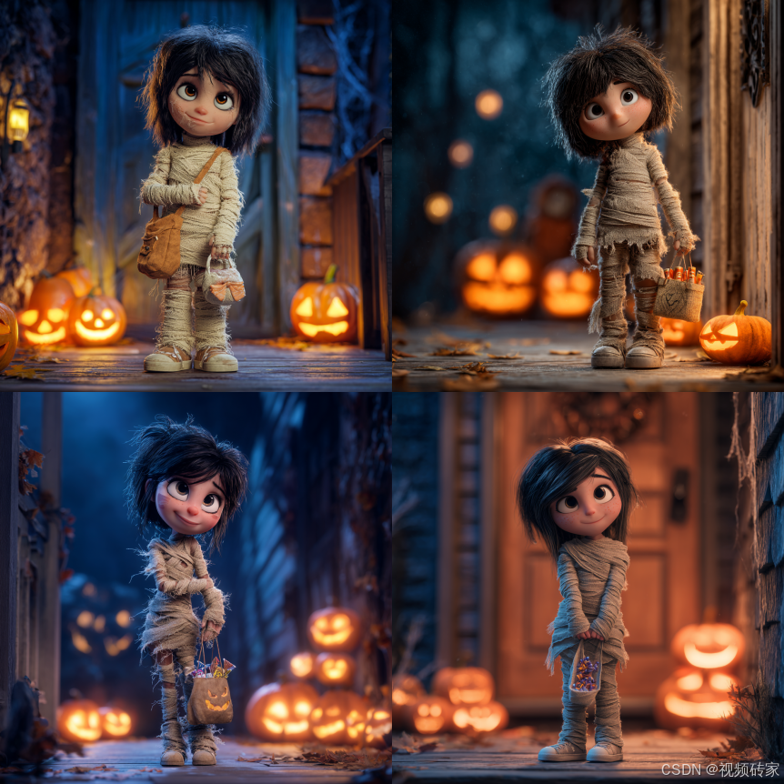 Prompt提示词:Soft-focus, cinematic portrait of a young girl, dark hair, standing on a warmly lit porch on Halloween night, dressed as a mummy in carefully wrapped gauze with frayed fabric edges, clutching a small candy bag, subtle smile of pride and shyness, skin has irritation on it, gentle autumn breeze ruffling the wraps, glowing jack-o’-lanterns at her feet, deep blue night in the background with faint blurred trick-or-treaters, her friends in other costumes behind her, stop-motion inspired textures, hand-crafted feel, rich tactile details in fabric and skin, warm golden porch light spilling across her face, she's wearing shoes, shallow depth of field, bokeh lights in distance, moody yet tender tone, highly detailed, award-winning animation aesthetic, inspired by Coraline and Laika films, dramatic, angle, closeup, style raw, q 5, soft lighting