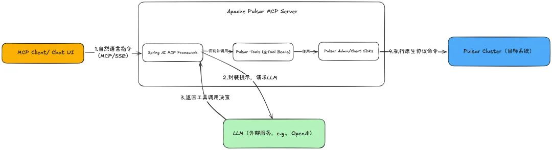 这是 Spring AI 提供的 MCP 服务器启动器,它处理了与 AI 模型通信的所有底层协议和复杂性,我们只需要专注于实现“工具”即可。它的职责是“理解”用户的意图和我们工具的描述,然后做出决策——应该调用哪个工具,以及传入什么参数。:用户的指令通过我们的应用,交由 LLM 进行“翻译”,翻译结果(工具调用)再由我们的应用执行,最终作用于 Pulsar 集群。:这是 Apache Pulsar
