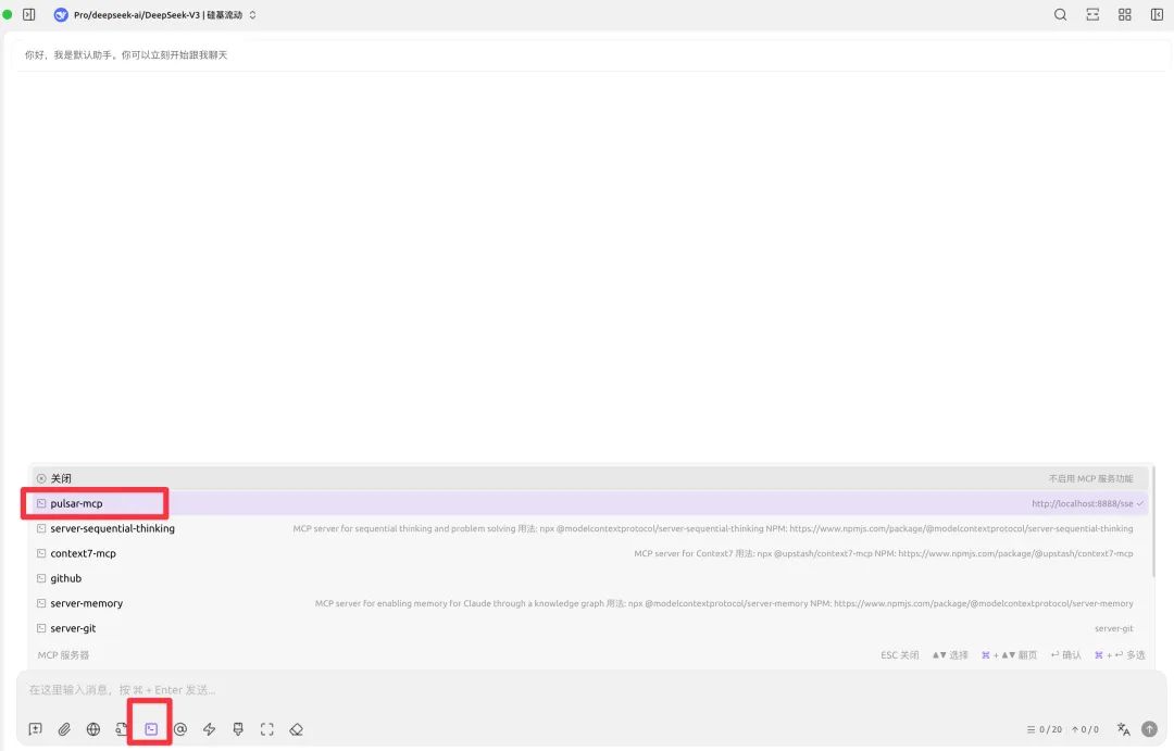在 cherry-studio 中创建一个新的助手并选中我们创建的 pulsar-mcp-server。