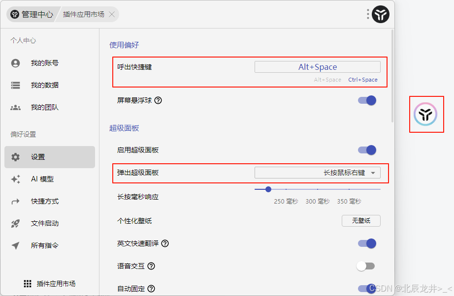 呼出小工具的方式有3种,其中使用键盘按键和鼠标长按的方式都是可以修改的,还可以点击悬浮球呼出。其他设置默认就好