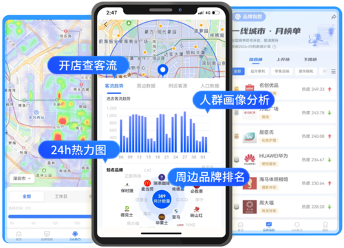 除了以上三大核心功能外,客流易APP还暗藏更多宝藏功能:一键生成区域热力图,直观呈现人气高地;一线城市品牌实力榜单,紧跟行业风向;周边人气旺铺,寻找学习标杆。