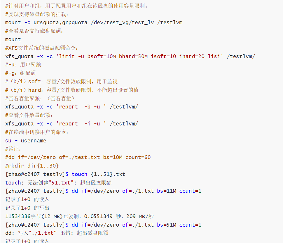 xfs_quota -x -c 'limit -u bsoft:30M bhard:50M isft:3 ihard:5 用户名' /挂载目录