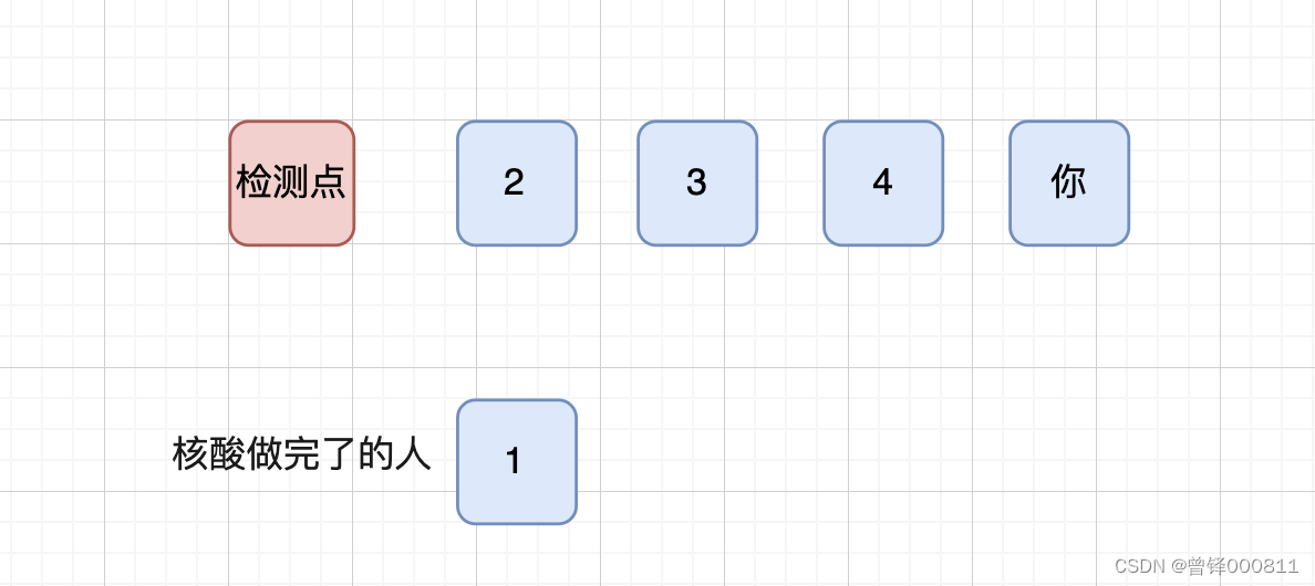 这玩意儿听着比较抽象,我们举个例子来说明一下:比方说现在你们这个区域的疫情比较严重,政府组织做核酸,你这会儿去排队前面有四个人,如图:
