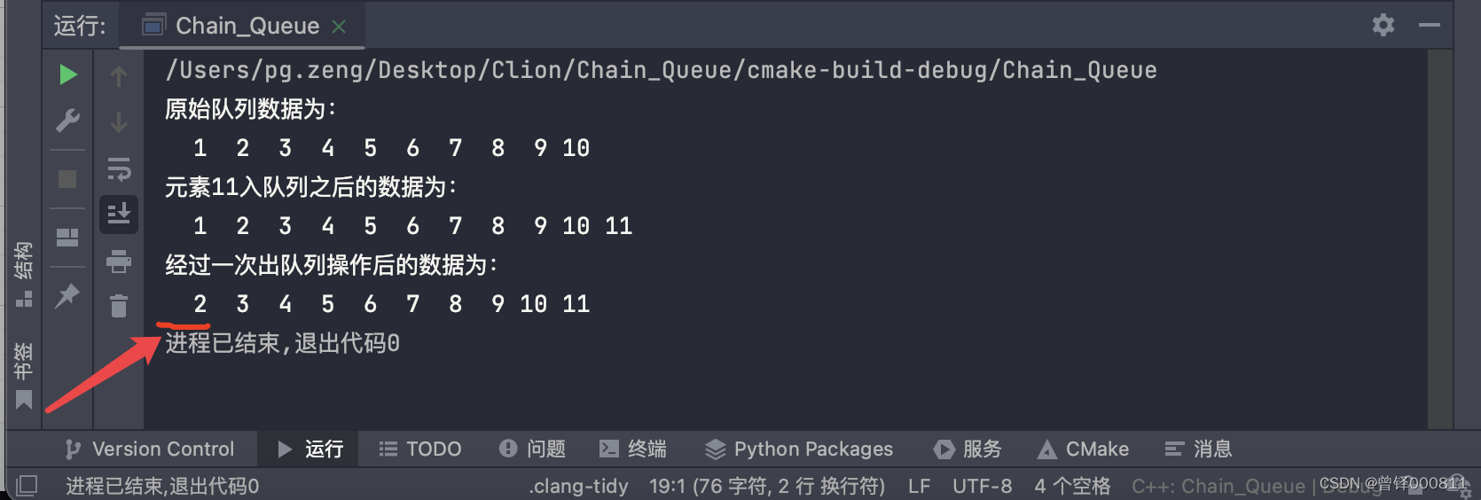 如图,获取到经过一次出栈操作之后的队首元素为2.