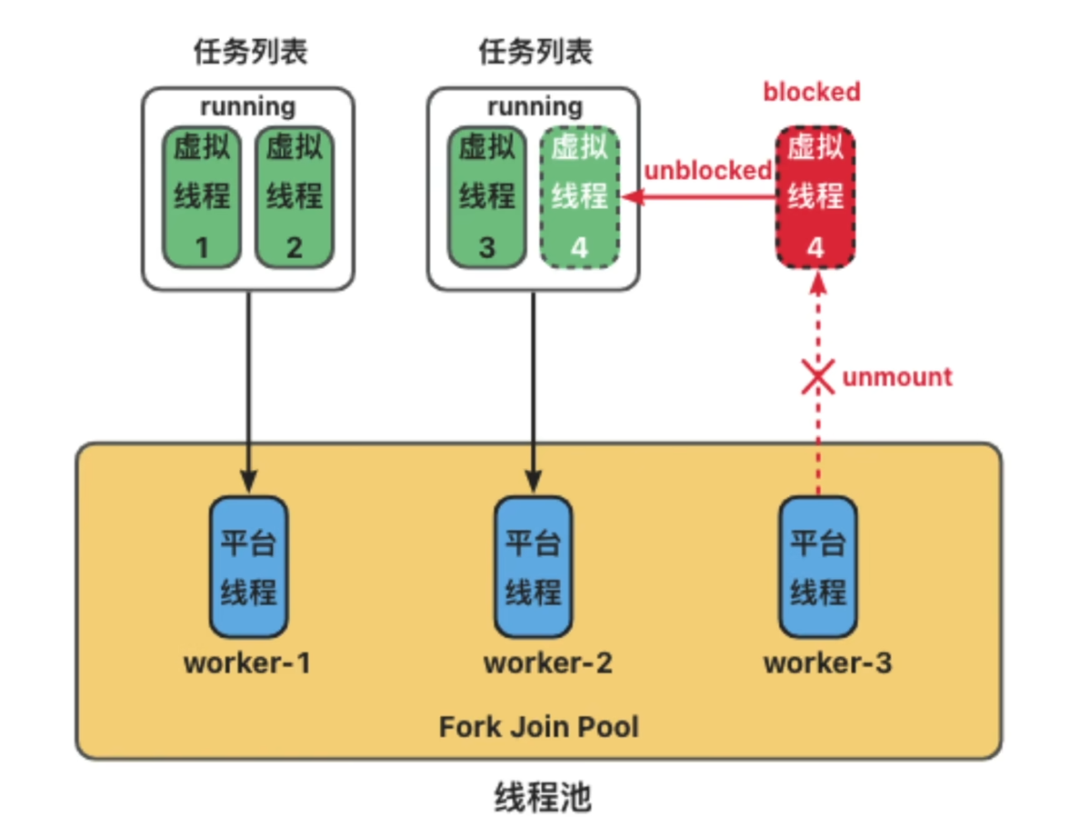当阻塞事件完成后,JVM会分配空闲的载体线程来搭载当前虚拟线程继续运行。
