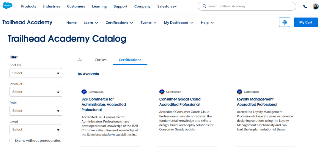 对于首次参加Salesforce认证的新用户,Trailhead Academy显著降低了入门门槛。你只需用Trailblazer账号登录,便可浏览全部认证考试项目和对应的学习资源。平台支持多维筛选(产品类别、岗位角色、认证等级),快速找到适合自己的证书。