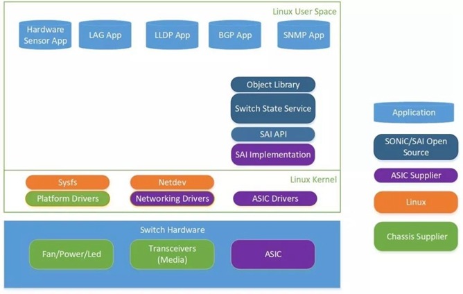 SONiC通过将SAI作为南北向互联的中间件,屏蔽不同ASIC之间的驱动差异,也正是由于SAI的存在,SONiC的网络功能应用才能够支持多个厂家的ASIC。网络软件建立在SAI(交换机抽象接口,SAI接口适配ASIC的工作由各个厂家实现)上,使其可以运行在各种硬件设备中,形成白盒交换机软件生态链。