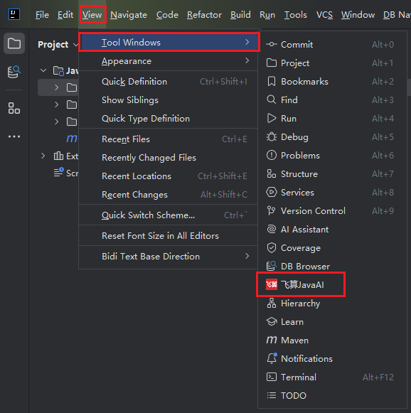 8、单击顶部菜单栏“View > Tool Windows > 飞算JavaAI”,即可打开。