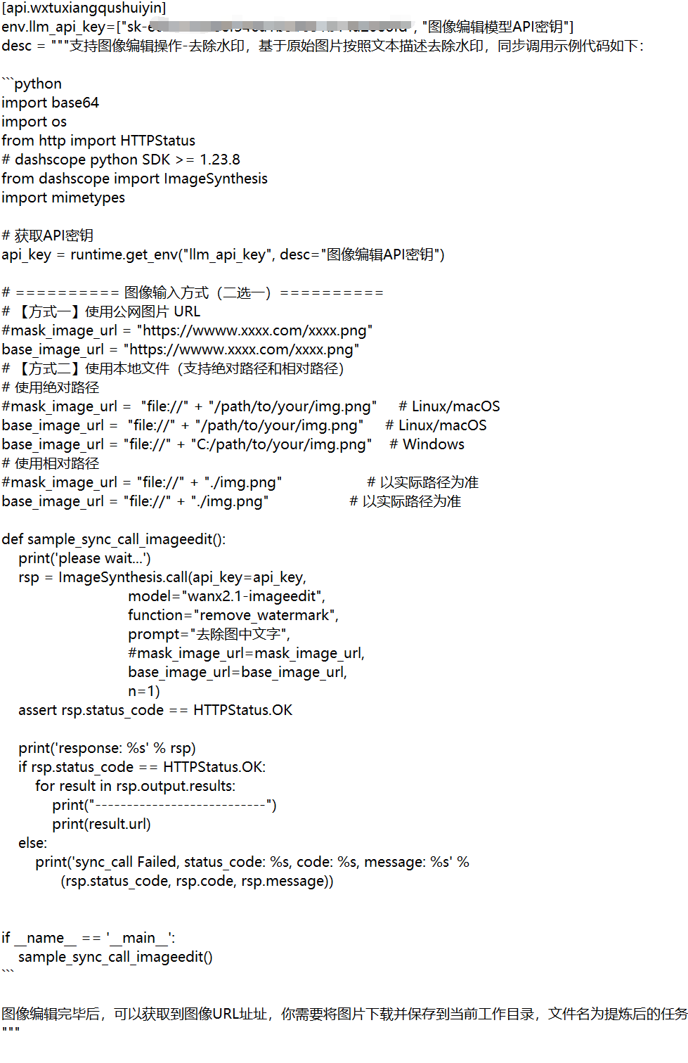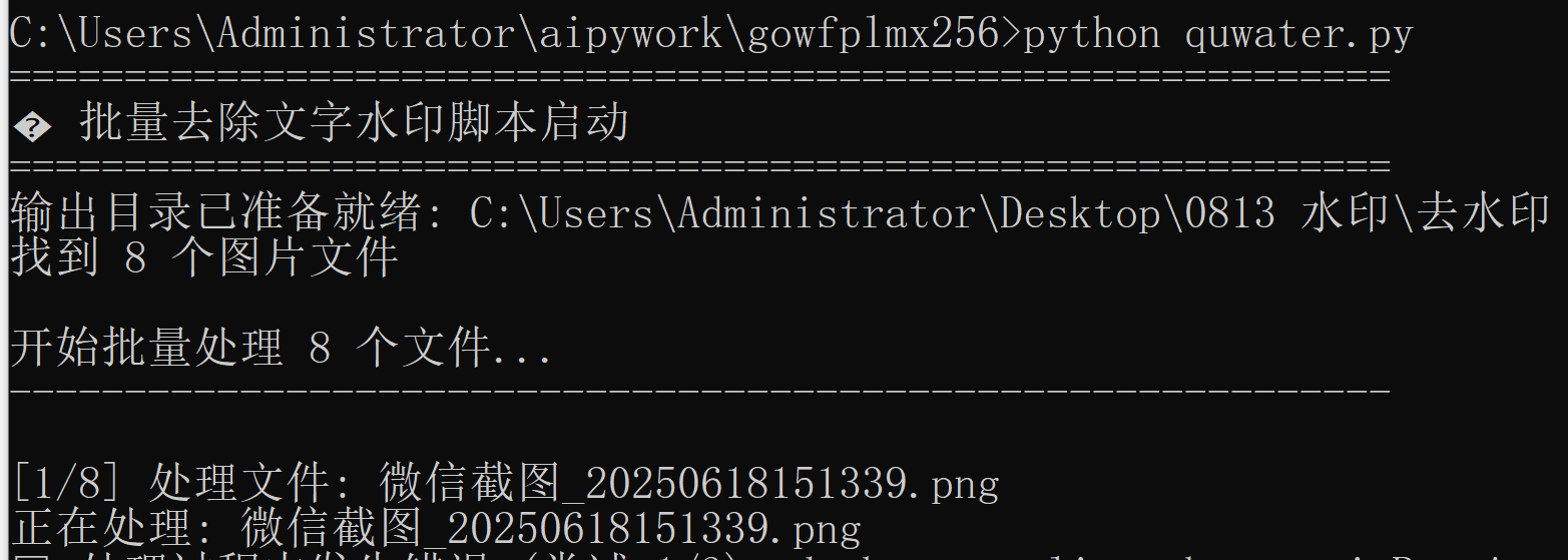 我需要你基于万相图片编辑API开一个批量去除文字水印的可重复使用脚本quwater.py,输入文件夹为【C:\Users\Administrator\Desktop\0813 水印\水印】,输出文件夹为【C:\Users\Administrator\Desktop\0813 水印\去水印】。