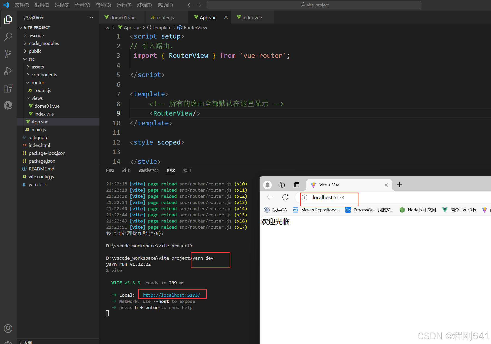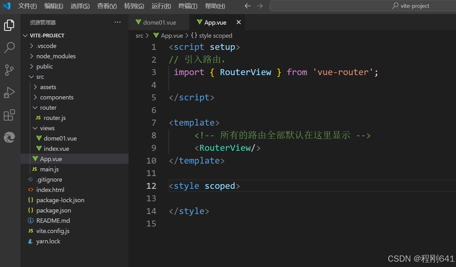 在App.vue页面引入路由,通过RouterView标签,作展示