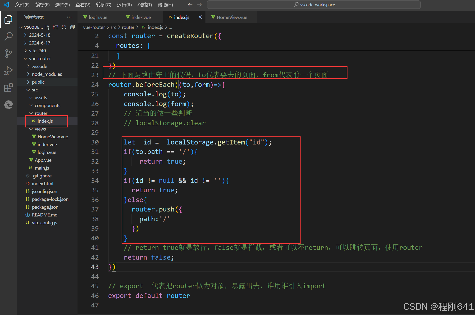 // return true就是放行,false就是拦截,或者可以不return,可以跳转页面,使用router