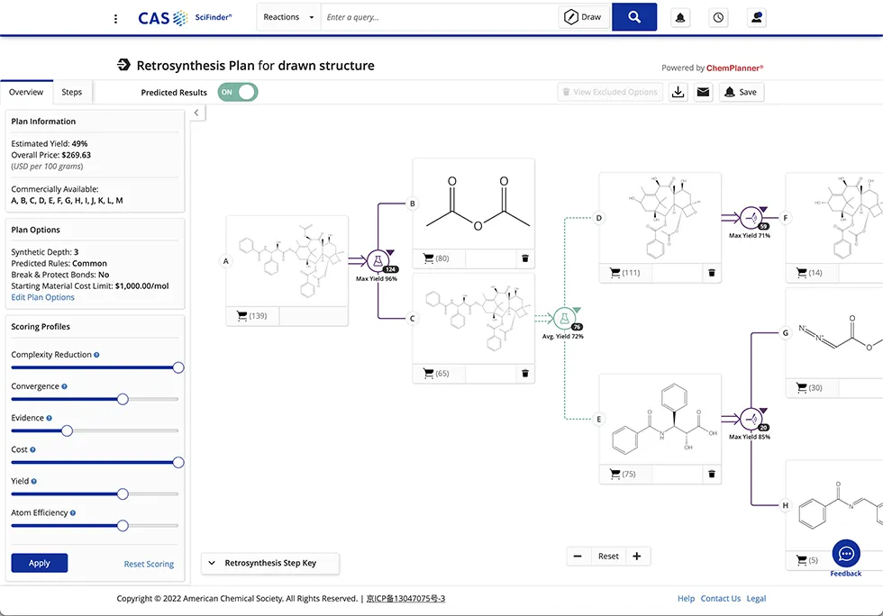 Reaxys Predictive Retrosynthesis推出了其预测性逆合成分析工具。它结合了文献中的反应数据和先进的算法,能够为目标分子提供精准的逆合成路线建议。Reaxys 拥有数百万条文献和专利数据,涵盖了有机化学、药物化学和材料化学的各个领域。因此,该工具不仅能够生成合理的合成路线,还能为每一步的反应提供相关的文献支持。Reaxys 采用先进的机器学习技术,能够根据历史反应数据自动生成合成路线,并且随着数据库的不断扩充,其预测结果的准确性和多样性也在提升。无论是初学者还是经验丰富的化学家,Reaxys Predictive Retrosynthesis 都能够为复杂分子设计提供有力的支持。