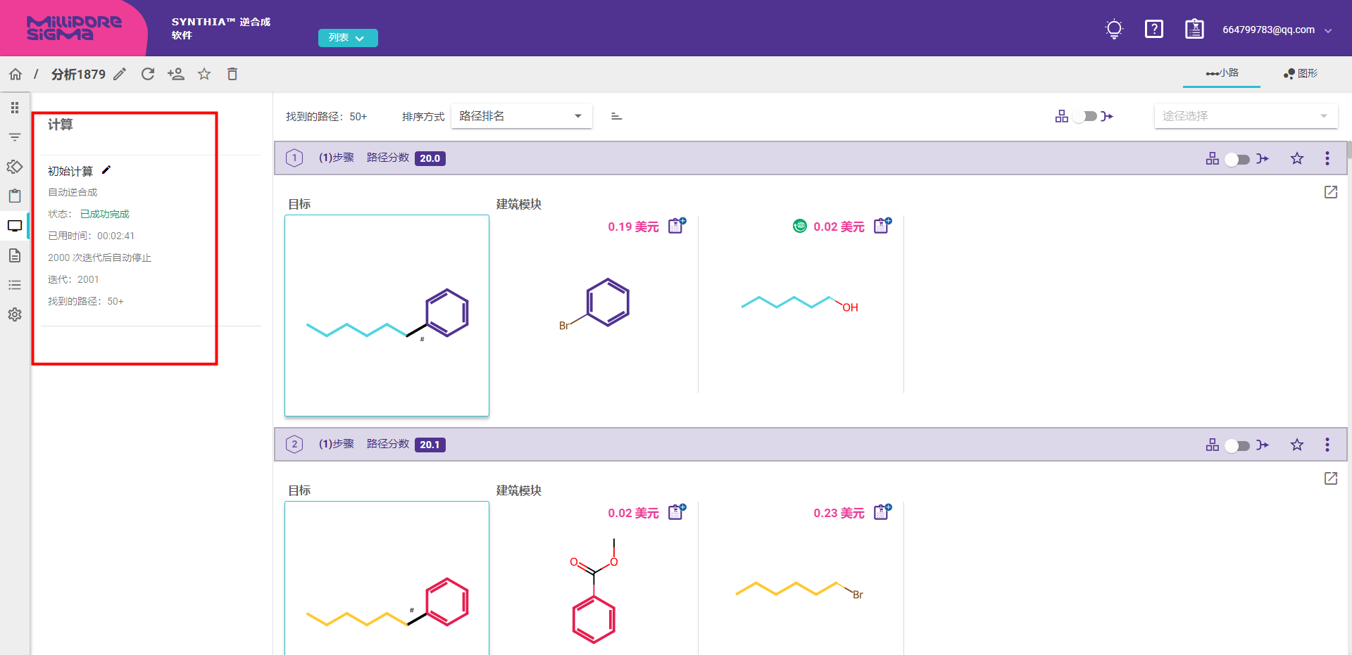 - 通过查看详细的分子结构或图形来轻松地筛选、分类、比较和分析定制路线,并找到最具成本效益的化学目标合成路线。