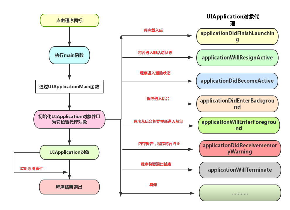 iOS程序的启动执行顺序 AppDelegate 及 UIViewController 的生命周期UIView的生命周期言叶之庭.jpeg一. iOS程序的启动执行顺序程序启动顺序图iOS启动原理图.png具体执行流程程序入口进入main函数,设置AppDelegate称为函数的代理程序完成加载[AppDelegate application:didFinishLaunchingWithOptio