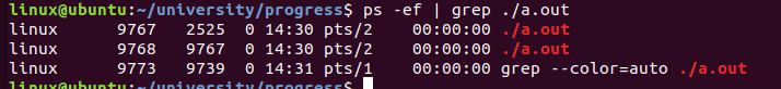 值得注意的是,fork返回的pid号只是作为父子进程内部的自我标识,而非真正的pid号,所以在通过类似ps -ef | grep ./a.out显示出的pid号并不为子进程返回的0。可以通过子进程的PPID等于父进程的PID来区分父子进程