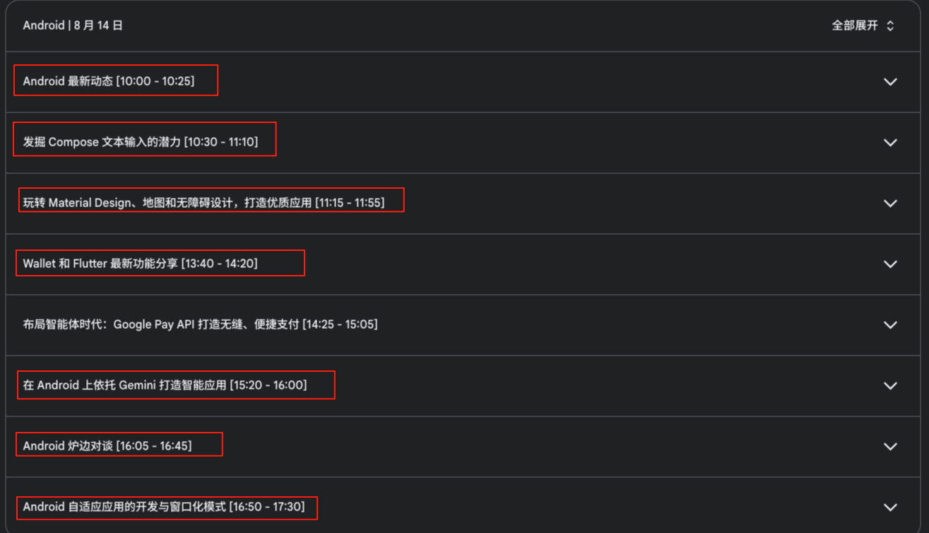 开发者大会的首日因为公司有事,所以错过了,今日专门请假参与,主要的重心就是安卓和端侧AI。图中红框中的内容,是我打算重点要听的。