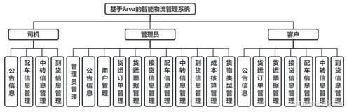 基于Java的智能物流管理系统的功能结构设计根据用户角色进行了清晰的划分:管理员作为系统最高权限用户,拥有对首页、管理员管理、用户管理、货运订单管理、货运票据管理、接货信息管理、配车信息管理、中转信息管理、到货信息管理、成本核算管理以及货物类型管理的全面控制,确保系统整体运行和数据的完整性;司机作为运输任务的执行者,其功能集中于首页、公告管理、配车信息管理、中转信息管理和到货信息管理,方便其查看任务并更新运输状态;客户作为物流服务的需求方,主要功能包括首页、公告管理、货运订单管理、货运票据管理、接货信息管理、配车信息管理、中转信息管理和到货信息管理,便于其下单、追踪订单状态并获取物流信息。这种角色化的功能设计确保了系统的高效性和用户体验的针对性,满足了不同用户的业务需求。系统功能模块图如图4-1所示。