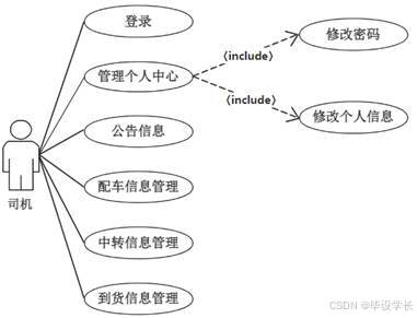司机系统功能模块包括首页、公告管理、配车信息管理、中转信息管理、到货信息管理等。司机用例图如图3-2所示。