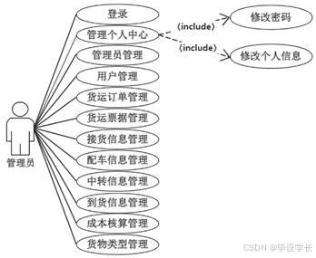 管理员系统功能模块包括首页、管理员管理、用户管理、货运订单管理、货运票据管理、接货信息管理、配车信息管理、中转信息管理、到货信息管理、成本核算管理、货物类型管理等。管理员用例图如图3-1所示。