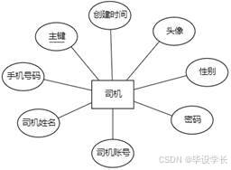 司机实体包括创建时间、手机号码、主键、头像、性别、司机姓名、密码、司机账号。司机实体属性图如图4-6所示: