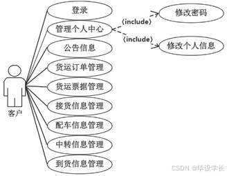客户系统功能模块包括首页、公告管理、货运订单管理、货运票据管理、接货信息管理、配车信息管理、中转信息管理、到货信息管理等。客户用例图如图3-3所示。