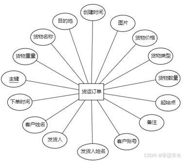 货运订单实体包括创建时间、货物名称、货物重量、主键、目的地、图片、货物价格、货物类型、货物数量、下单时间、客户姓名、发货人、客户账号、备注、起始点、发货人姓名。货运订单实体属性图如图4-2所示: